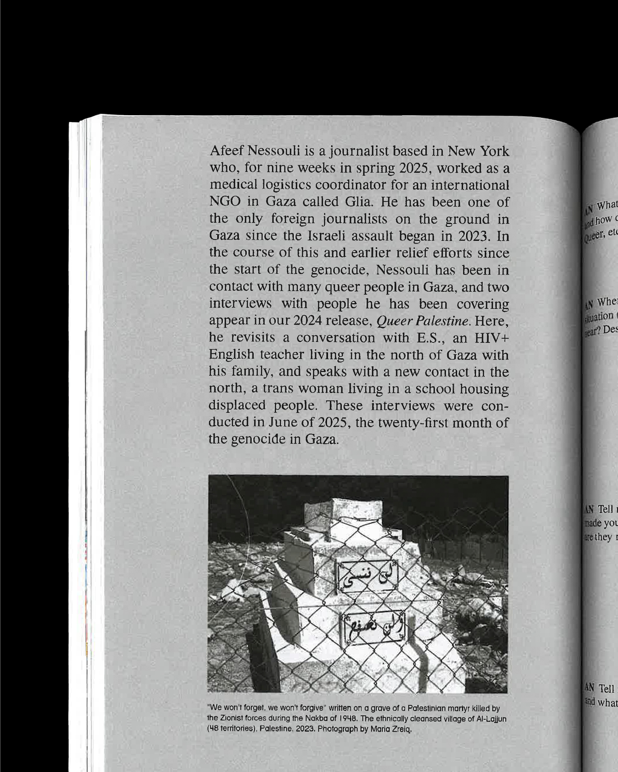 After a detour to publish two books, Queer Palestine and After Accountability, we are now proud to present our latest magazine issue. You will find new essays by Corey Devon Arthur and Bruno Monfort, a conversation between Emma Heaney and Sophie Lewis, interviews with Amal and E.S., queer Palestinians in Gaza, a Q&A with trans furry hackers, a new transcript from the late Cecilia Gentili, art by Maria Zreiq, Sol Brager and much more. This issue showcases the trenchant originality at work in the real movement for gender and sexual freedom, and documents the historical transformations over the past years in this volatile terrain.